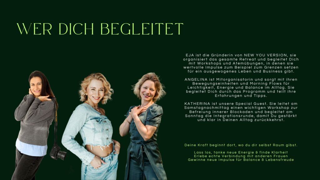 Wir, Angelina, Eja und Sandra, sind drei selbstständige Frauen, die sich zusammengetan haben, um einen Raum zu schaffen, in dem Frauen sich gegenseitig stärken, inspirieren und wachsen lassen. Wir wissen, wie es sich anfühlt, immer stark sein zu müssen und dabei sich selbst aus dem Blick zu verlieren.